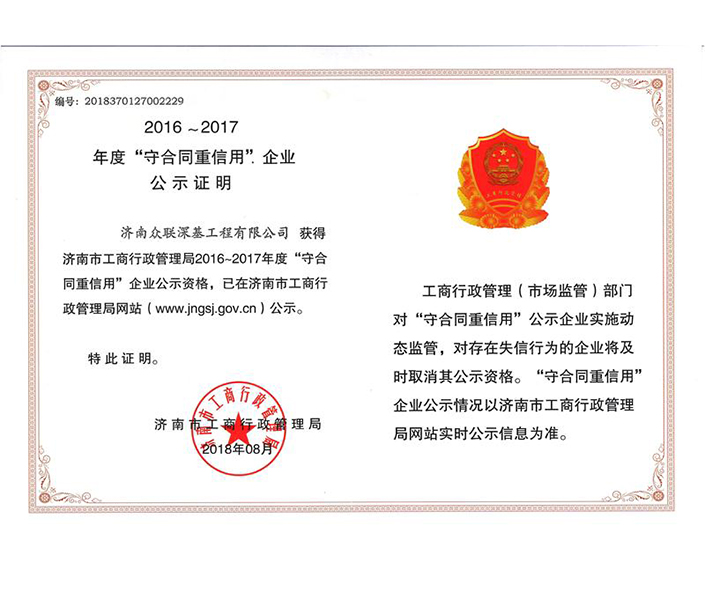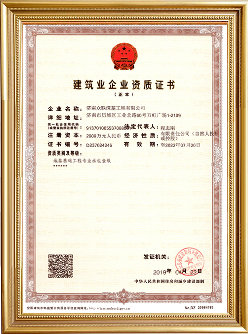 山東眾聯(lián)恒信工程集團(tuán)有限公司成立于2010年4月20日,注冊(cè)資金2000萬(wàn)元,固定資產(chǎn)8500萬(wàn)元,公司主要從事地基基礎(chǔ)、勘察、設(shè)計(jì)等方面的專(zhuān)業(yè)承包,地基基礎(chǔ)專(zhuān)業(yè)施工資質(zhì)壹級(jí)。